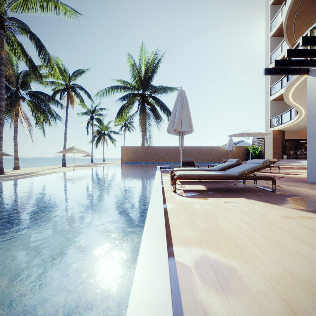 Uma imagem que parece ser uma fotografia real do empreendimento, mas na verdade é uma combinação de elementos renderizados em 3D e uma fotografia do ambiente real.